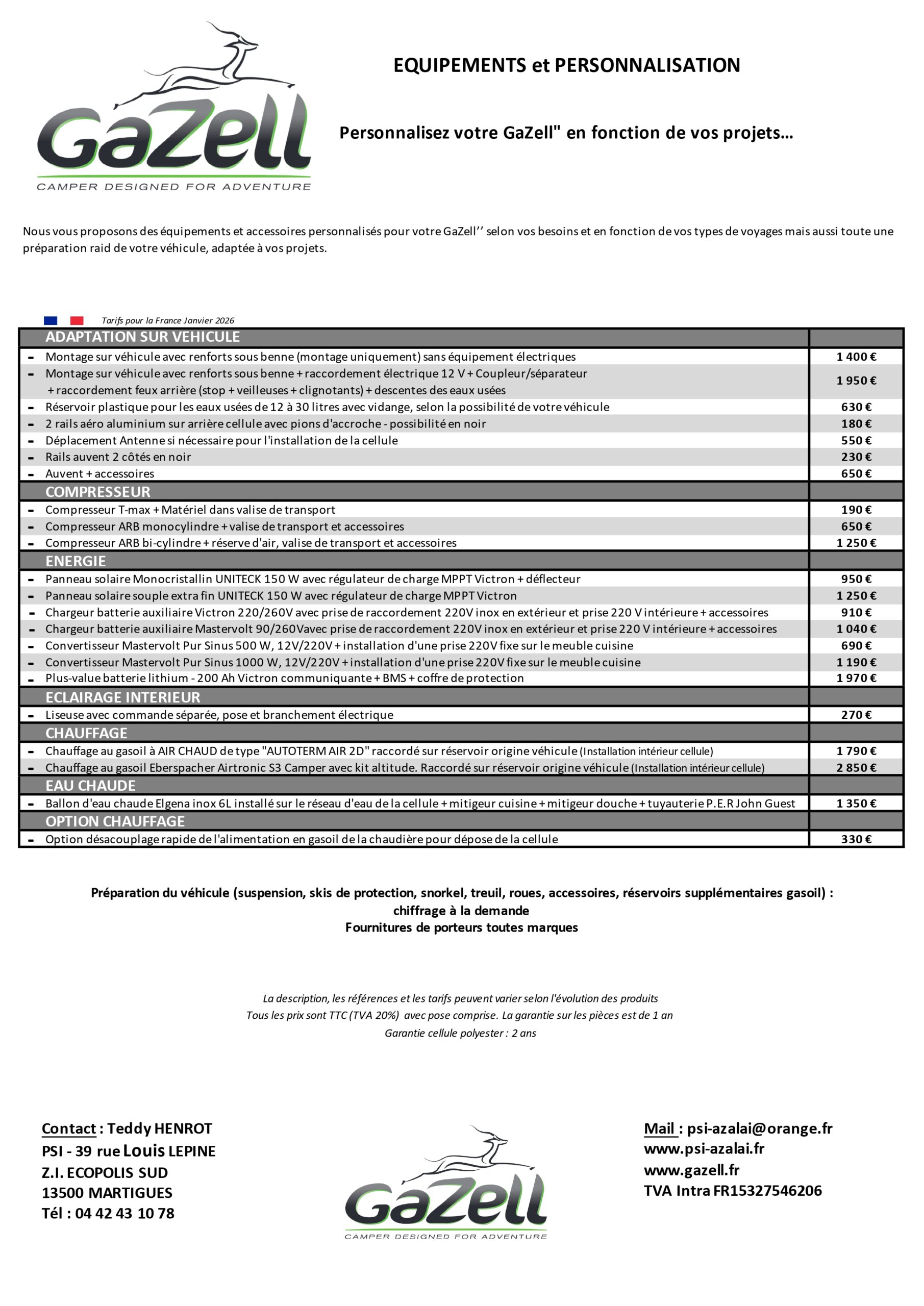 Garantie : la GAZEL est garantie DEUX ans sur toute sa structure polyester, les accessoires et les équipements bénéficient d’une garantie d’UN an.